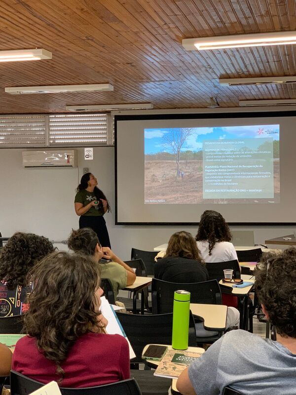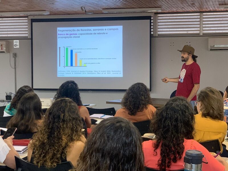 Durante a palestra sobre as metodologias de Restauração Ecológica no Cerrado, o doutorando em Ecologia de Sementes, Maxmiller Ferreira, explicou que o bioma é um mosaico de paisagens, em que 70% é caracterizado como savânico, 6% como campestre e o restante como formações florestais. Ele ressaltou a importância de um esforço coordenado e direcionado onde há uma necessidade de compreender a vegetação local e a gestão adequada dos bancos de sementes, elementos cruciais no processo de recuperação.